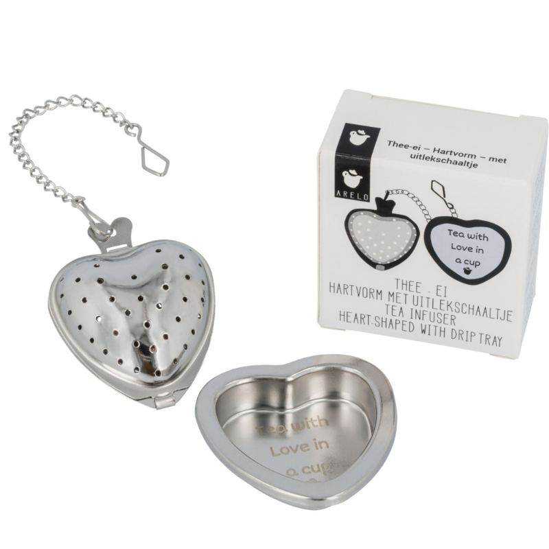Dit hartvormige thee-ei met uitlekschaaltje maakt van ieder theemoment iets bijzonders. Met de lieve tekst “tea with love in a cup” is dit niet zomaar een theezeefje, maar een klein gebaar vol warmte en aandacht.